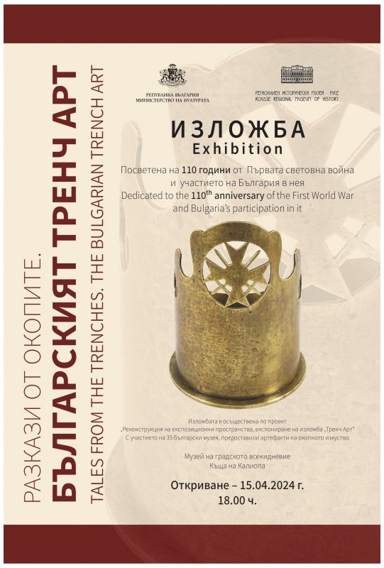 Вчера, 15 април, в Музей на градското всекидневие - Къща на Калиопа в Русе, се откри временната изложба „Разкази от окопите. Българският тренч арт“. Тя е посветена на 110-годишнината от Първата световна война и участието на България в нея. Изложбата представя така наречения„ trench art” (окопно изкуство) – световен феномен, свързан с изработваните в окопите предмети, определяни в повечето случаи като сувенири.