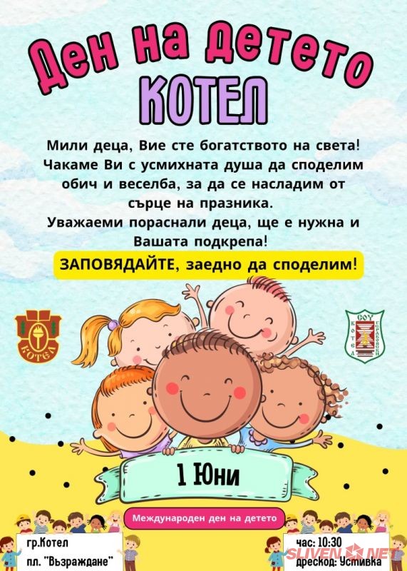 Община Котел традиционно организира богата и интересна програма, посветена на 1 юни – Международен ден на детето. Тази година екипът на кмета Каранашев гласува доверие на младите аниматори от средно училище „Георги Ст. Раковски“, като им възложи частичната организация на празника, както и изработването на плаката за събитието.