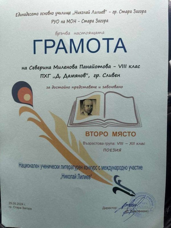 Северина Панайотова – ученичка от VIIIа клас в Хуманитарната гимназия „Дамян Дамянов“, бе отличена за участието си в националния ученически литературен конкурс „Николай Лилиев“. Конкурсът се организира от XI ОУ „Николай Лилиев“ и РУО на МОН – Стара Загора. Нашето момиче бе класирано на второ място във възрастова група VIII – XII клас за поезия. Поздравяваме Северина с отличието и представяме двете стихотворения, с които се е включила в конкурса.