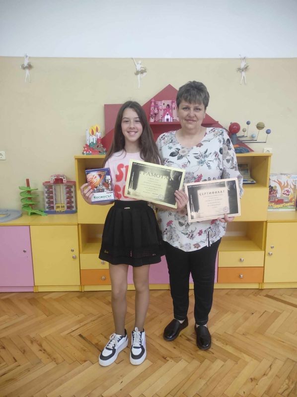 Поздравления за Никол Маринова и Неделина Добрева от 4. клас, които се класираха на второ и трето място в конкурса „Космосът е безкраен“, направление – макет, организиран от ЦПЛР – АО „д-р Петър Берон“ – гр. Сливен.