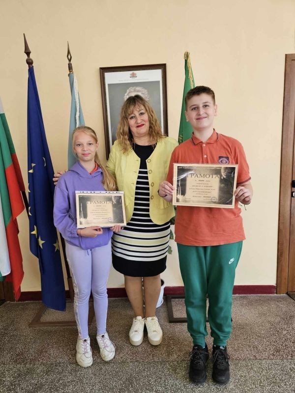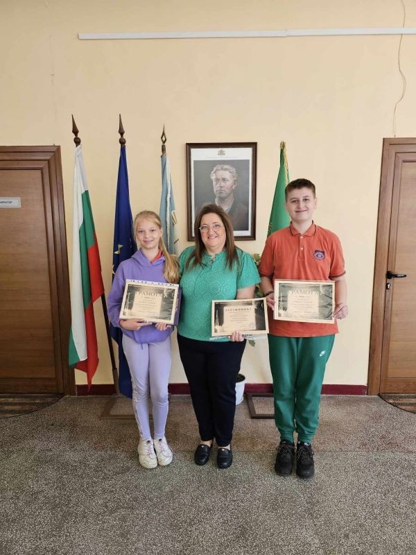 Днес Георги Георгиев получи своята награда за първо място, а Моника Иванова - награда за трето място. С грамота бе отличена и тяхната учителка - г-жа Здравка Долушанова.