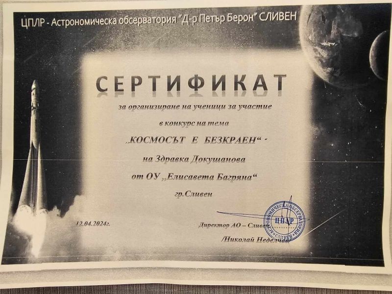 Отличията са за участие в конкурса на тема ,,Космосът е безкраен", който бе организиран от Астрономическа обсерватория "Д-р Петър Берон" - Сливен.