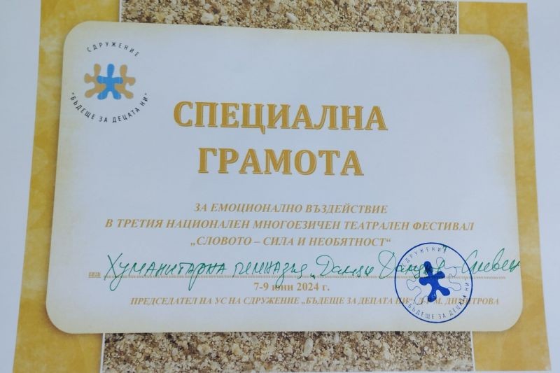 Учениците актьори от театралната ни трупа се завърнаха от участие в многоезичен театрален фестивал „Силата на словото“ със Специалната награда на журито. Възпитаниците на Хуманитарна гимназия показаха класа, стил и индивидуализъм измежду 58 състава от цялата страна. Постановката „Тук се запознах с теб“ предизвика истински фурор сред публиката и журито. Въпреки пречещите обстоятелства (спирането на тока), непосредствено преди началото на представлението, не попречиха на талантливите ни артисти да представят достойно Гимназията. Ако все още не сте гледали спектакъла „Тук се запознах с теб“, имате последна възможност на 21 юни в зала „Зора“, когато трупата ни ще участва в Националния детско-юношески театрален фестивал „Сцена под Сините камъни“ в град Сливен. Ще ви очакваме!