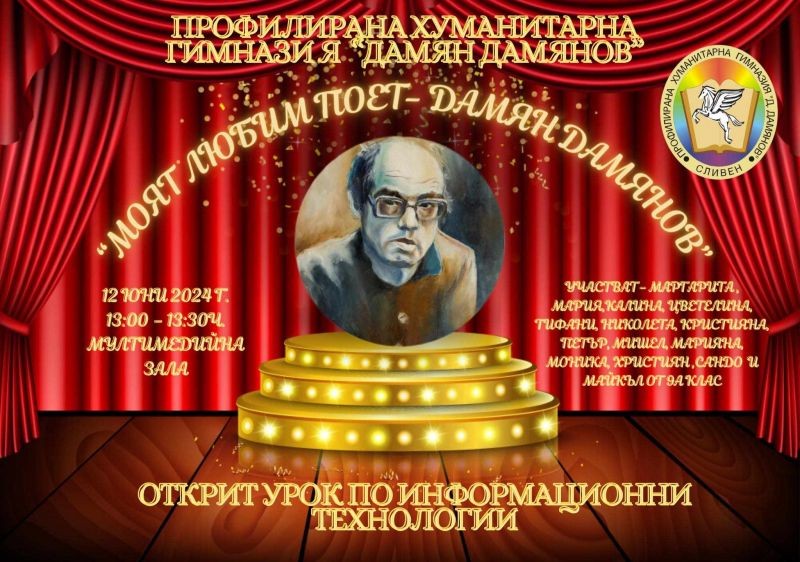 На 12 юни бе проведен открит урок по информационни технологии в 9.а клас на тема: „Моят любим поет - Дамян Дамянов“. Учениците работиха по следния казус:
