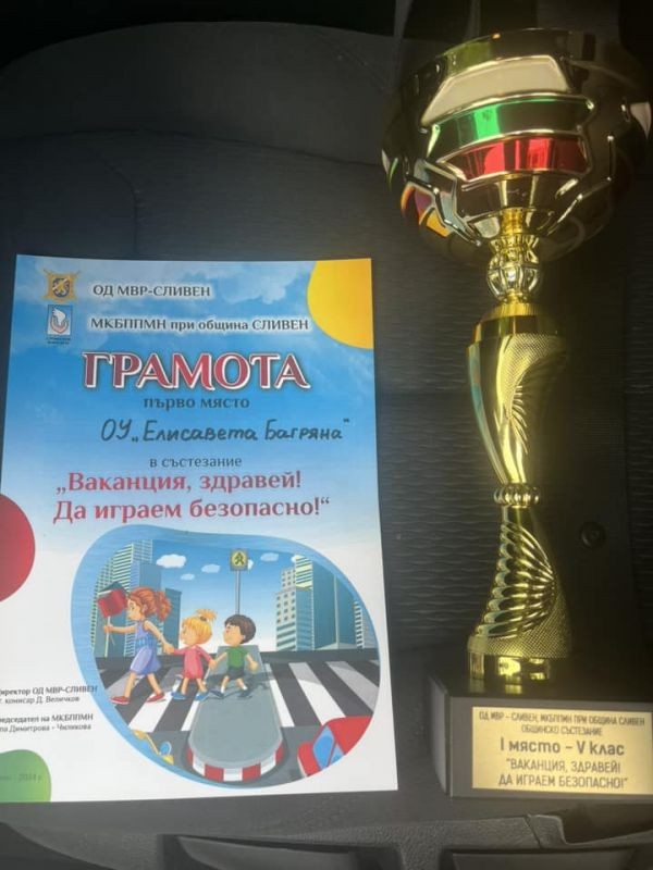 ПЪРВО МЯСТО спечели отборът на ОУ "Елисавета Багряна" в третото издание на ученическото състезание под надслов „Ваканция, здравей! Да играем безопасно!”, организирано от ОД на МВР, в партньорство с МКБППМН