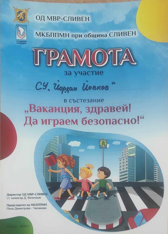 На 13.06.2024 г., ученици от 5. клас взеха участие в състезание под мотото „Ваканция, здравей! Да играем безопасно!“, организирано от ОД МВР – Сливен и МКБППМН при община Сливен.