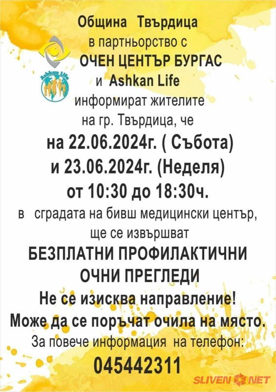 Община Твърдица в партньорство Очен център Бургас и Ashkan Life организират безплатни профилактични очни прегледи в гр. Твърдица на 22.06 (събота) и 23.06 (неделя) от 10:30 ч. до 18:30 ч. , в сградата на бивш Медицински център.