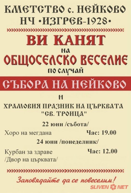 Жителите на балканското село Нейково за поредна година ще отбележат през уикенда празника на селото си, а в началото на другата седмица, този на църквата си „Св. Троица“.