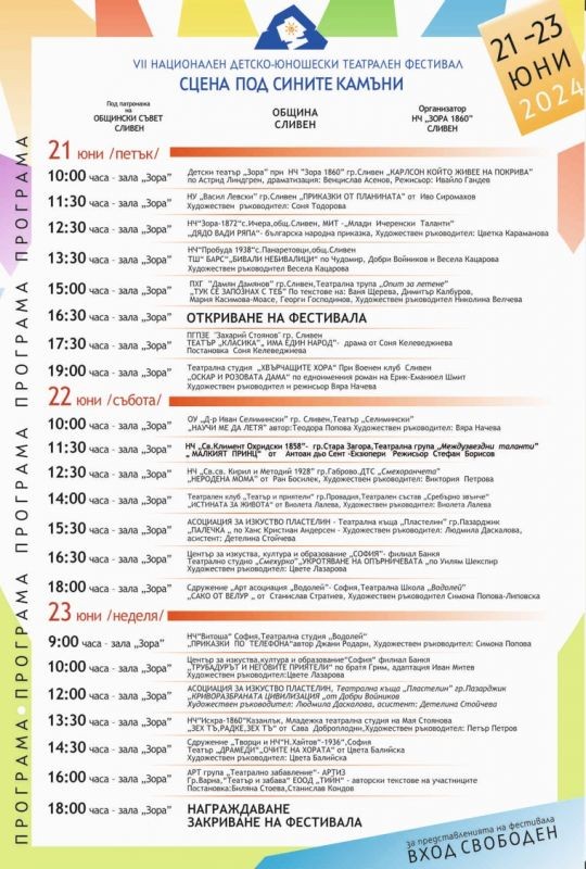 В Сливен предстои VII Национален детско-юношески театрален фестивал „Сцена под Сините камъни“. Вече превърналият се в традиция актьорски форум привлича и посреща в разгара на лятото млади театрални формации от страната. Тазгодишното издание започва на 21 юни, петък. Официалното откриване ще се състои в зала „Зора“ от 16.30 ч.