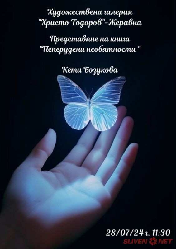 Ден по-късно, на 28 юли /неделя/, в галерията ще се представи новата поетична книга на Кети Бозукова “Пеперудени необятности”. Представянето на книгата ще бъде от 11 часа съвместно с откриването на изложбата на известния български художник, живописецът Сули Сеферов.