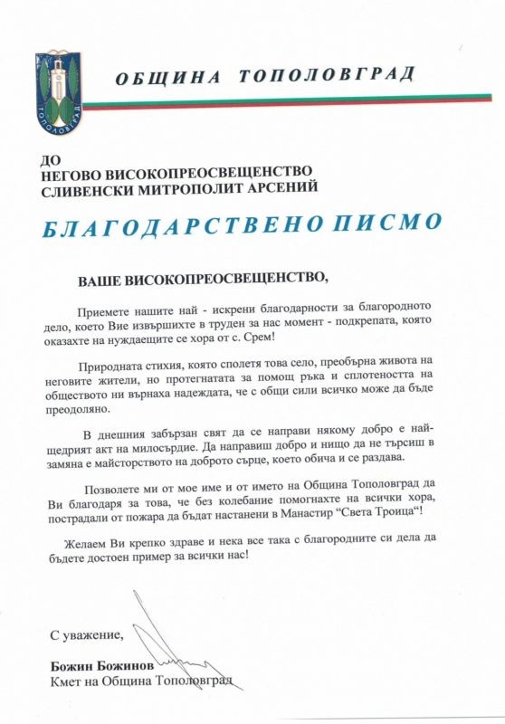 Кметът на Община Тополовград г-н Божин Божинов изпрати специално благодарствено писмо до Негово Високопреосвещенство Сливенския митрополит Арсений, в което му благодари за подкрепата, която Владиката оказа на пострадалите от пожарите хора от село Устрем.