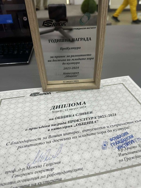 Община Сливен с поредно признание - получи награда за принос в достъпа на младите хора до култура