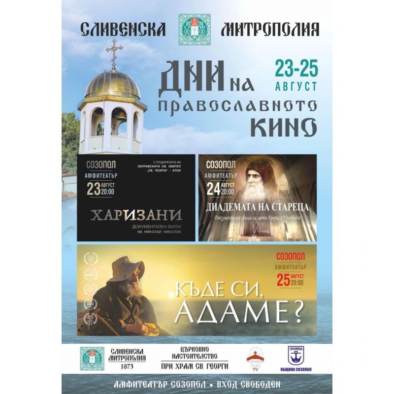 С благословението на Негово Високопреосвещенство Сливенския митрополит Арсений, Църковното настоятелство при храм “Св. Георги“, телевизия "Епархийски глас" и Община Созопол организират ДНИ НА ПРАВОСЛАВНОТО КИНО от 23 до 25.08.24 г. в амфитеатъра на град Созопол.