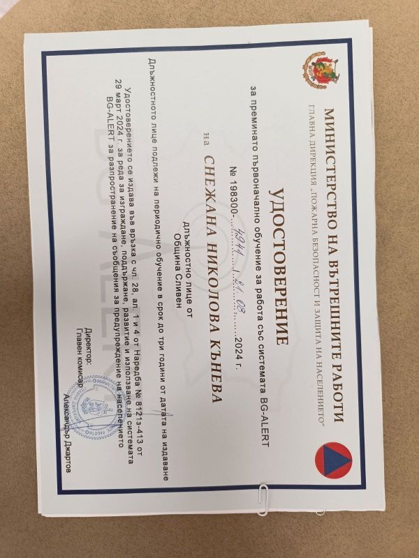 Служител на Община Сливен премина през обучението за работа със системата за pанно известяване - BG-Alert. Това е Снежана Кънева - главен експерт в Отдел “Сигурност и управление при кризи. Обученията се извършват от Националната служба "Пожарна безопасност и защита на населението" на база заявеното желание от кметовете на общини. Системата работи с мрежата на мобилните оператори и съобщенията й достигат до хората чрез мобилни телефони, таблети, някои смарт часовници. Обучените ще имат право да създават съобщения за опасност. Ползването на системата не е задължително, а препоръчително.