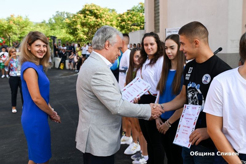 По време на церемонията бяха наградени всички отличници от учебната 2023-2024 г. Грамотите им връчиха част от официалните гости, сред които бяха председателят на Общински съвет-Сливен Димитър Митев, председателят на Постоянната комисия за децата, младежта и спорта Пламен Крумов, известният български спортист и зам.-кмет на Ямбол Енчо Керязов.