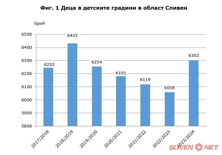 През учебната 2023/2024 г. детските градини в област Сливен са 59 и броят им им остава непроменен спрямо 2022/2023 учебна година. Броят на децата, записани в детските градини за учебната 2023/2024 г. е 6 302, което е с 244, или с 4.0% повече от броя им през предходната година.
