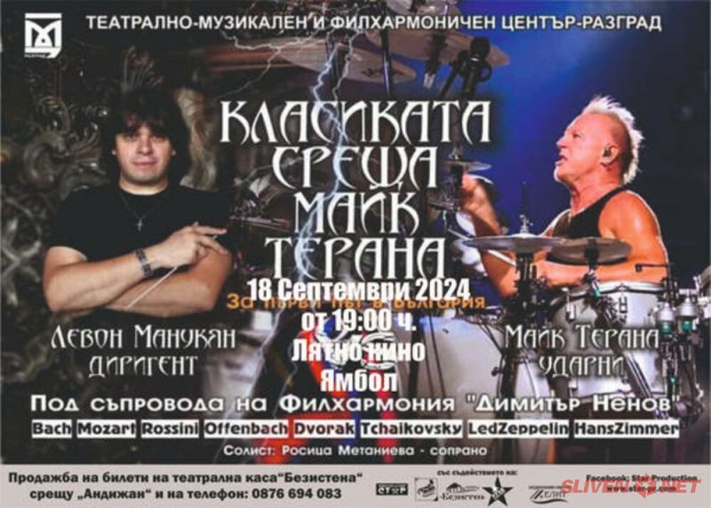 В Ямбол на 18 сепември ще бъде представен новият музикален проект на световноизвестния барабанист Майк Терана, маестро Левон Манукян и Разградската филхармония „Димитър Ненов“. Концертът „Класиката среща Майк Терана“ ще е на 18 септември в Лятното кино, а при неподходящи метеорологични условия – в Зрителната зала на Община Ямбол, съобщиха организаторите от Star Productions.