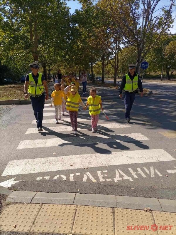 Децата от детска градина „Еделвайс” в град Сливен посрещна началника на сектор „Пътна полиция” главен инспектор Илиян Николов и инспектор Николай Атанасов в час по пътна безопасност. Полицейските служител проведоха урок по безопасно поведение на пътя като повече от час ангажираха вниманието на децата с правилата за движение, безопасно пътуване като пътници в автомобилите и безопасно управление на велосипеди. Запознаха се на практика с основните знаци и светофарната уредба. Под строй, заедно със своите учители, те показаха как се пресича правилно на пешеходните пътеки на кръстовището с булевард „Стефан Стамболов” и „Георги Данчев”. Детската градина се намира в най-големия квартал на град Сливен „Дружба” и те всеки ден се движат по тези булеварди и се налага да пресичат. Децата показаха сериозни познания по темата за безопасността, похвалиха своите родители, че редовни си слагат предпазните колани и използват детски столчета в личните автомобили. Знаят от коя страна трябва да слизат от автомобила, за да е безопасно и познават голяма част от пътните знаци.