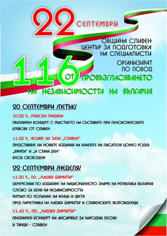 В Сливен събитията по повод обявяването на независимостта на България, провъзгласена на 22 септември (5 октомври нов стил) 1908 година, ще започнат от 20 септември, петък.