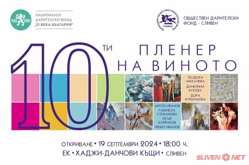 Седем сливенски художници представят седемнадесет творби в Десетия пленер на виното, съобщиха организаторите от Фондацията "Обществен дарителски фонд-Сливен", съвместно с Национален дарителски фонд "13 Века България".