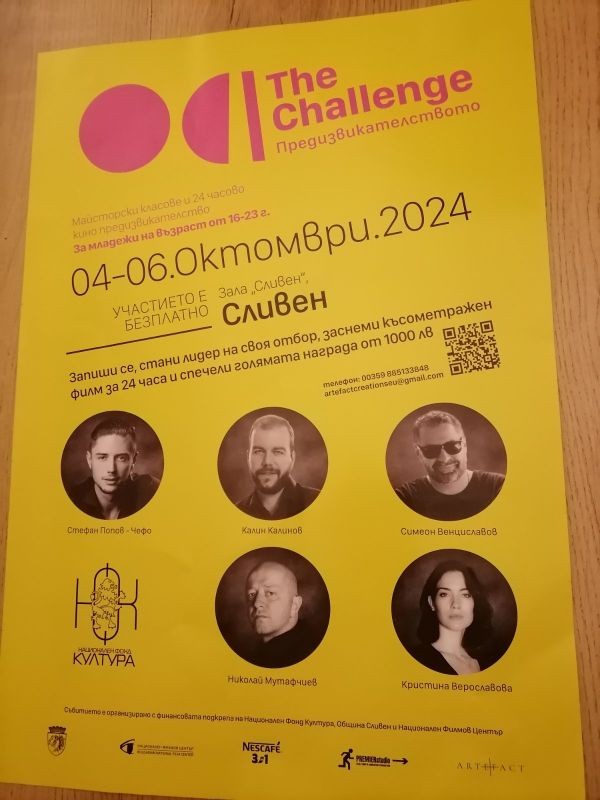 „Предизвикателството“ е уникална възможност за всеки, който се интересува от света на киното, да покаже и развие своя талант. Участниците ще имат възможността да се включат в майсторски класове, водени от професионалисти в киноиндустрията, сред които Стефан Попов-Чефо (актьор), Калин Калинов (продуцент), Симеон Венциславов (сценарист), Кристина Верославова (актриса) и Николай Мутафчиев (режисьор). Майсторските класове ще обхванат различни сфери като: кинорежисура, продуцентство, сценарно писане, операторско и актьорско майсторство.