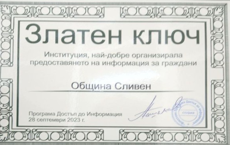 Отново признание за Община Сливен – за поредна година Общината е номинирана за най-престижната награда „Златен ключ“ в категория „Институция, най-добре организирала предоставянето на информация за граждани“, която се връчва от Фондация „Програма Достъп до Информация“ /ПДИ/.