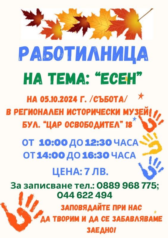 Имаме удоволствието да Ви поканим на творческа работилница в музея на тема "Есен". Ще изработваме картички и украса за дома от естествени материали.