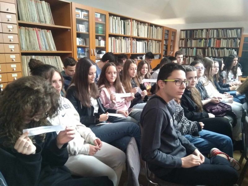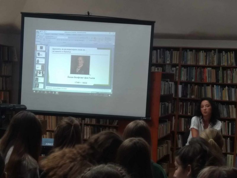 Друга инициатива от празника на Обединена Германия беше и работното посещение на Регионалната библиотека „Сава Доброплодни“ – Сливен, където на осмокласниците беше представена презентация с интересни и значими факти от житейския път и творчеството на немския поет и философ Йохан В. фон Гьоте! За отбелязването на 275 год. от рождението на великия немски писател, всеки осмокласник получи подарък с крилата фраза и цитат на Гьоте!
