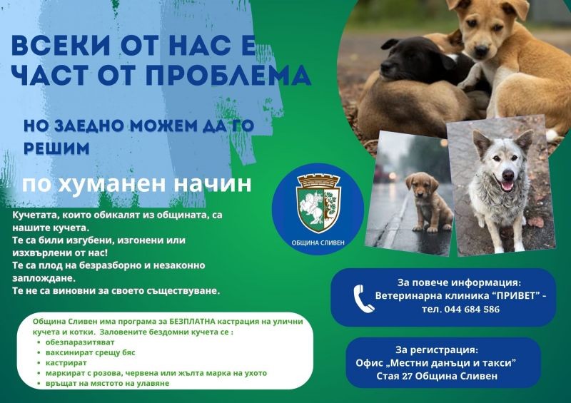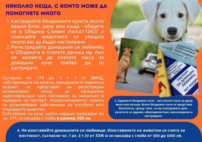Община Сливен апелира гражданите да бъдат отговорни стопани на своите домашни любимци и да не допускат свободното им движение на обществени места, паркове, градини, детски площадки и на места, обозначени със забранителни знаци. Кучетата се водят на повод, а ако с поведението си може да заплаши хора или животни – и с намордник. Напомня се също, че стопаните са длъжни да почистват след кучето си по време на разходка. Ако поради някаква причина стане невъзможно да бъде гледано дадено куче или неговото поколение, трябва да му се потърси добър стопанин, а не да бъде изоставено.