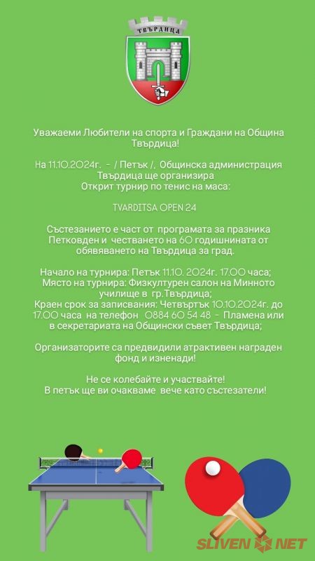 На 11.10.2024 г. от 17 часа Общинска администрация Твърдица организира Открит турнир по тенис на маса TVARDITSA OPEN 24, който ще се проведе във физкултуриния салон на Минното училищ