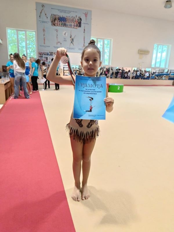 Поздравления за нашата първокласничка - Даян Николова, която спечели бронзов медал във вида смесена двойка на провелото се контролно състезание по акробатика през почивните дни в зала "Младост".