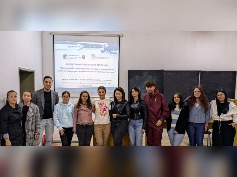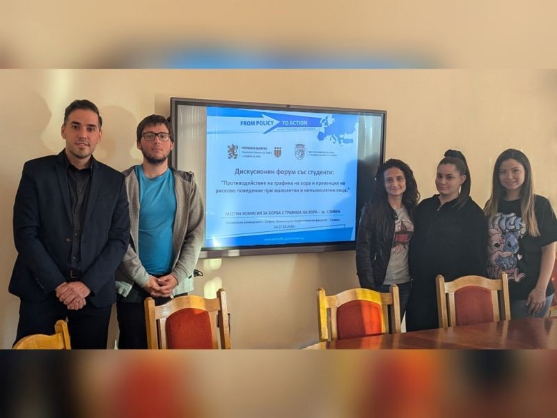 По повод 18 октомври – Европейския ден за борба с трафика на хора, Местната комисия за борба с трафика на хора (МКБТХ)-Сливен проведе дискусионен форум на тема „Противодействие на трафика на хора и превенция на рисково поведение при малолетни и непълнолетни лица”. Дискусията беше със студенти от втори курс, специалност „Педагогика” в Технически университет-София, Инженерно-педагогически факултет-Сливен, в рамките на дисциплина „Методи за работа с деца и младежи в риск”, под ръководството на доц. д-р Марлена Данева.