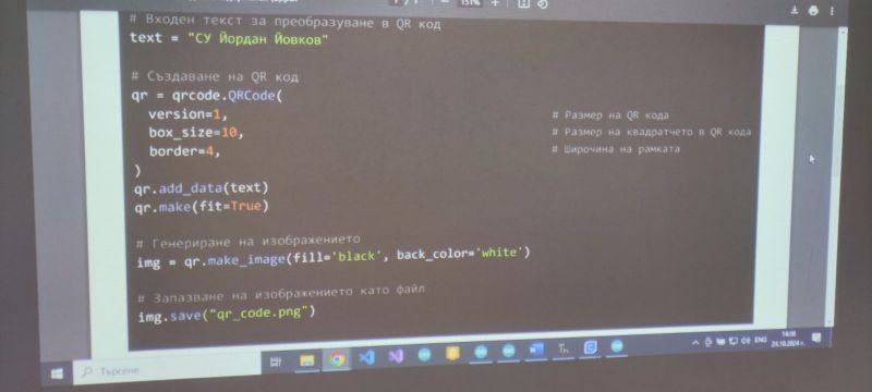 Под ръководството на инж. Димитър Желев, инж. Виктор Диндев и Антон Веснаков – ръководител направление „ИКТ“, учениците създадоха код на Python, генериращ персонализирани QR кодове, които съдържат техните собствени имена. Тези QR кодове първо бяха визуализирани като 2D изображения, след което, използвайки платформата Tinkercad, бяха превърнати в 3D модели.