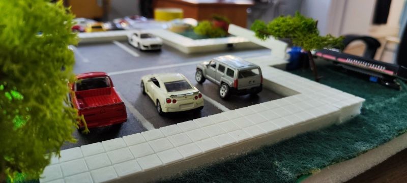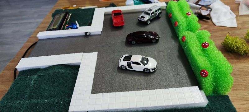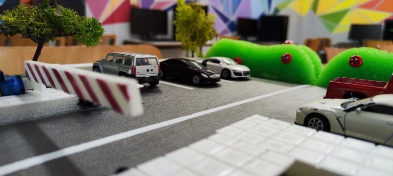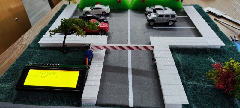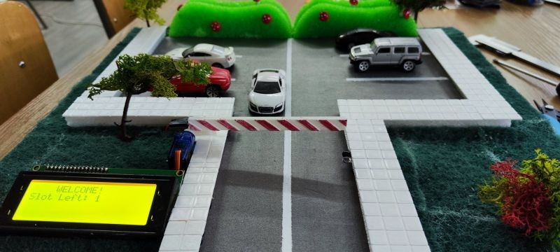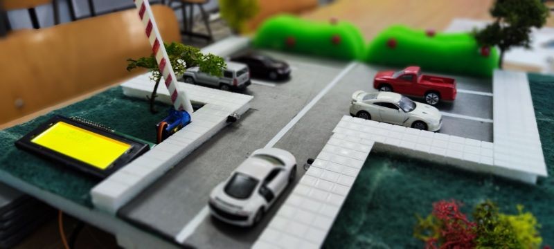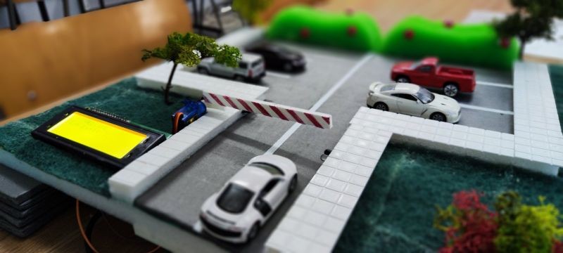 Проектът включва макет на паркинг, който не само отчита броя на свободните места, но и предоставя информация на посетителите чрез дисплей на входа.