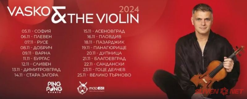 На 12 ноември 2024 г. от 19:00 часа световноизвестният цигулар Васко Василев ще изнесе концерт в Драматичен театър „Стефан Киров“ в Сливен. Събитието, озаглавено "Vasko & The Violin," обещава незабравима музикална вечер, изпълнена с виртуозни изпълнения и вдъхновяваща атмосфера.