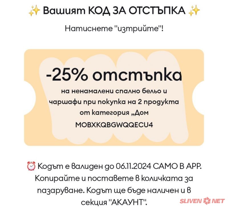 Особеност, на която също си струва да се обърне внимание, е че валидността на кода за отстъпката е до 24 часа, което изисква и по-спешно решение за извършване на покупката.