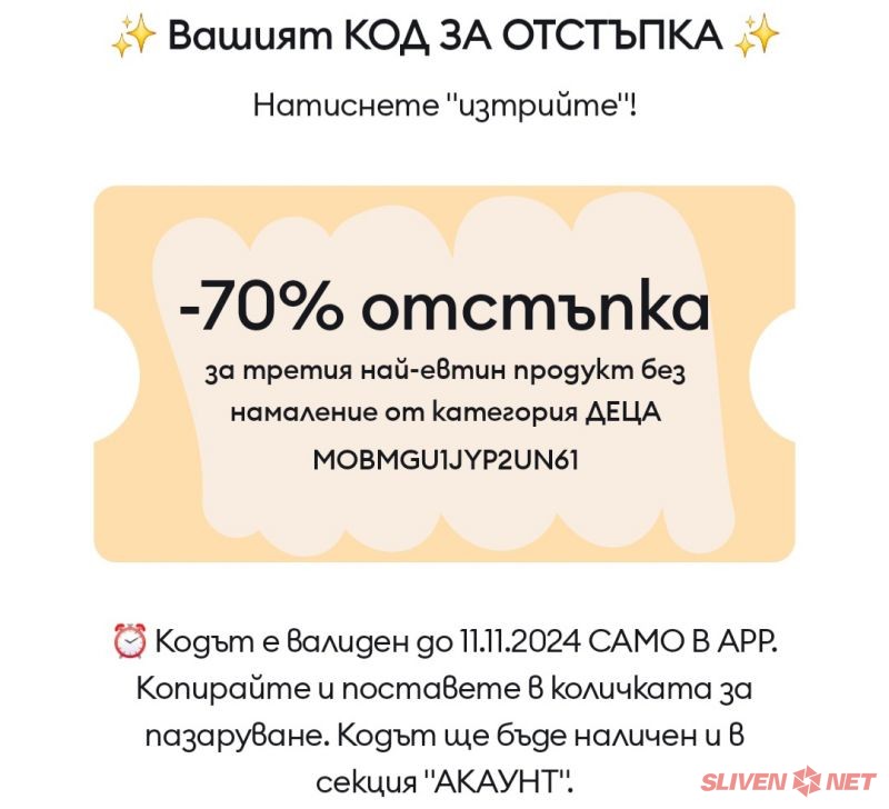 Особеност, на която също си струва да се обърне внимание, е че валидността на кода за отстъпката е до 24 часа, което изисква и по-спешно решение за извършване на покупката.