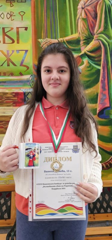 Първо място и златен медал получи талантливата Ванеса Динева от 7. ,,в“ клас от XVII Национален празник на детското изкуство в конкурса ,,Вълшебният свят на Родопите“- Кърджали 2024г.