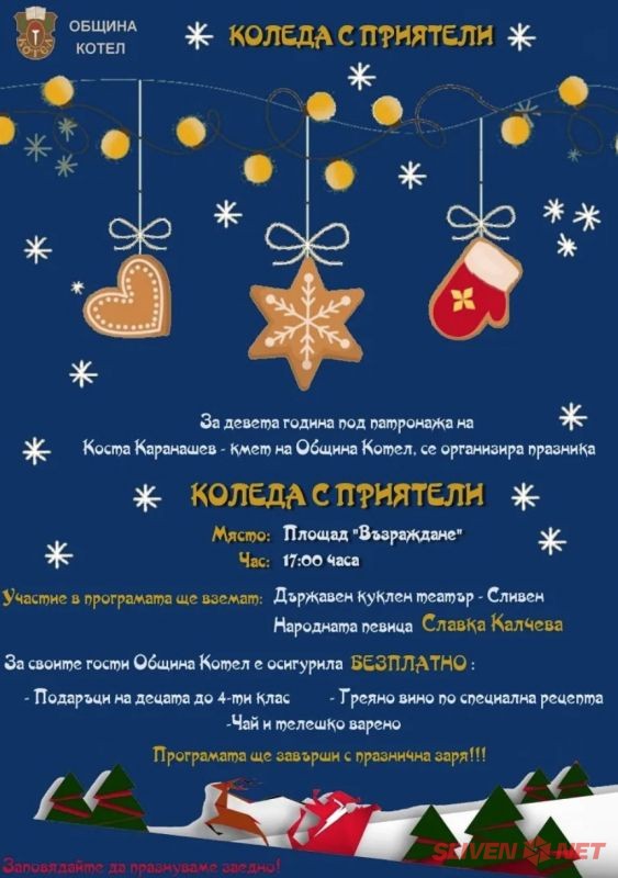Кметът на Община Котел – г-н Коста Каранашев, отправя покана към всички жители и гости на града да се присъединят към IX-то празнично тържество „Коледа с приятели“. Събитието ще се проведе на 18 декември 2024 г. (сряда) от 17:00 часа на площад „Възраждане“.