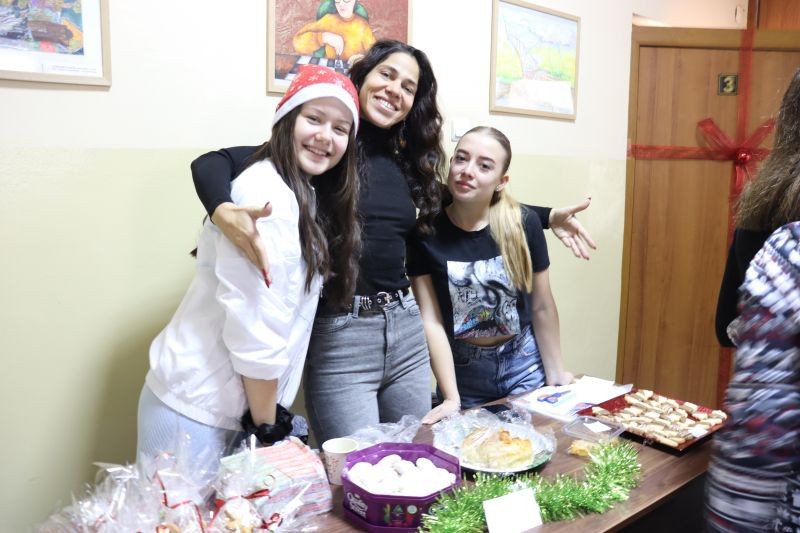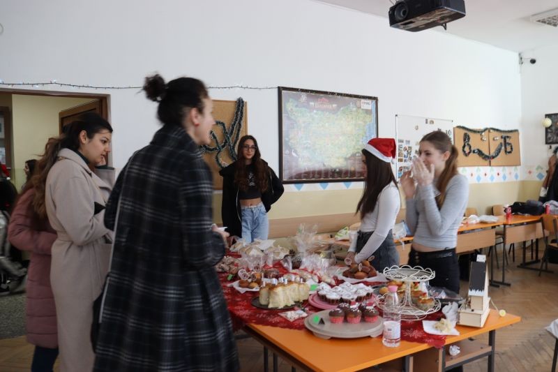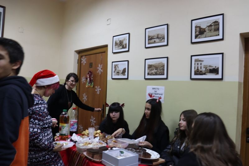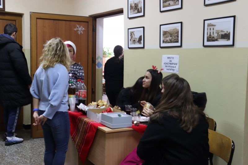 Коледното настроение завладя днес класните стаи и коридорите на Хуманитарна гимназия „Дамян Дамянов“. В Първи корпус на училището се проведе Коледен базар, на който всички класове подредиха празнични маси с лакомства. Очакваме утре на Коледното шоу да бъдат обявени победителите в конкурсите за най-добре украсена класна стая, най-добър майстор на солени и сладки изкушения, най-празничен щанд на Коледния базар. Доброто настроение и предусещането за празничните и ваканционни дни бе завладяло всички ни. Средствата, събрани по време на Коледния базар и Коледното шоу, традиционно по решение на зрелостниците се даряват за благотворителна кауза. На всички приятели на Хуманитарната гимназия пожелаваме светли и изпълнени с обич празнични дни!