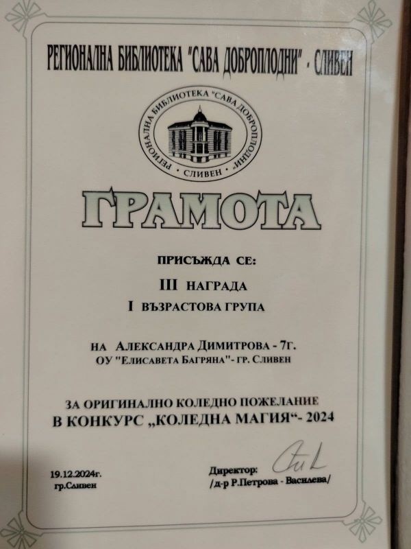 Стефания Атанасова от 2. ,,а" клас завоюва трето място за най-красива картичка в първа възрастова група. Александра Димитрова от 1. "д" клас спечели трето място за оригинално пожелание в конкурса ,, Коледна магия", организиран от Регионална библиотека „Сава Доброплодни" - Сливен.