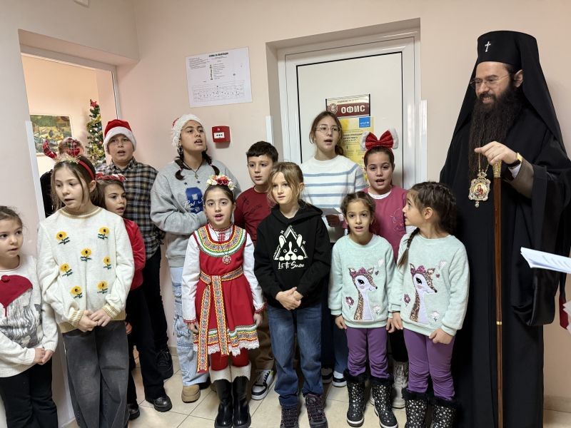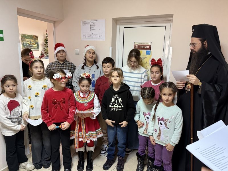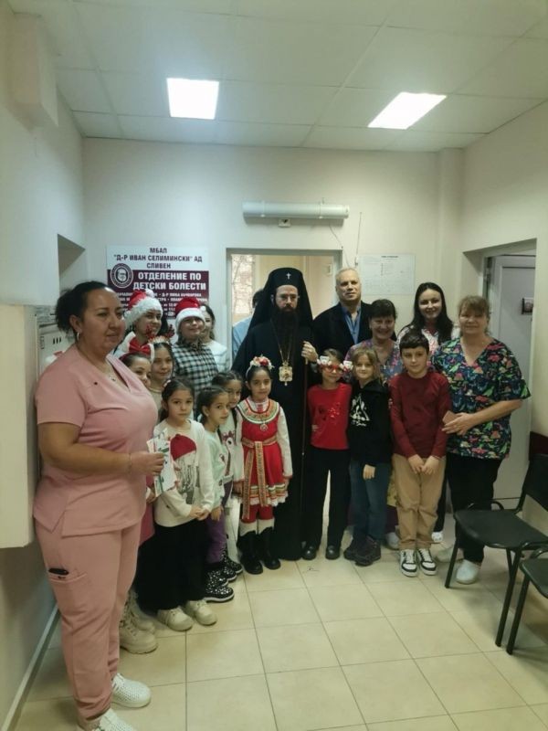 Владиката беше придружен от духовния надзорник ик. Йоан Петров, г-жа Ани Вълева, завеждаща Културно-просветния отдел при Сливенска света митрополия, и децата на “Ангелофания”, които поздравиха лекуващите се деца в отделението с празнични рождественски песни.