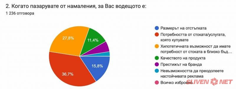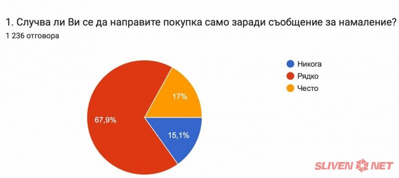 Близо 68% от българите признават, че макар и рядко, все пак правят покупка само заради съобщение за намаление. Водещи при вземането на решението са потребността от продукта или хипотетичната възможност да имат потребност от него в близко бъдеще. Заради атрактивни отстъпки преобладаващата част от хората биха пазарували от непознат магазин само след проучване на търговеца или препоръка от познат.
