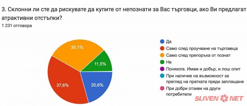 В отворен отговор на въпроса: “Склонни ли сте да рискувате да купите от непознати за Вас търговци, ако Ви предлагат атрактивни отстъпки” участвалите в проучването са посочили още, че биха купили от непознати търговци заради намаление, но само при наличието на добри отзиви на други потребители или на възможност за преглед на пратката преди заплащане.
