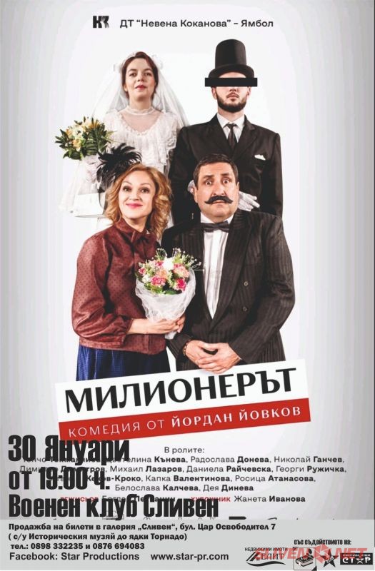 На 30 януари 2025 г. от 19:00 часа в Военния клуб – Сливен (ДНА) ще се състои постановката „Милионерът“ от Йордан Йовков. Събитието е организирано от Star Productions и Драматичен театър „Невена Коканова“ – Ямбол.