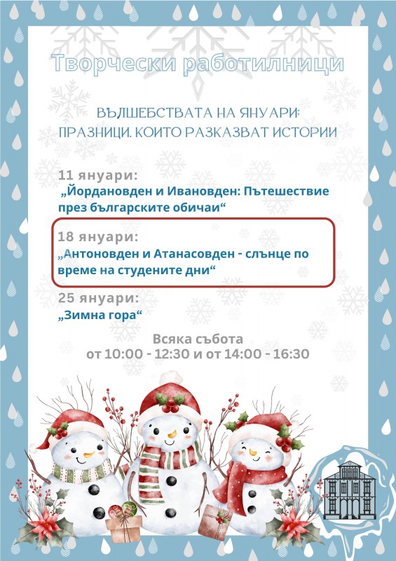На 18 януари 2025 г., събота, в сградата на Регионален исторически музей - Сливен ще се състои поредната творческа работилница, посветена на януарските празници. По повод Антоновден и Атанасовден сме предвидили следните дейности: