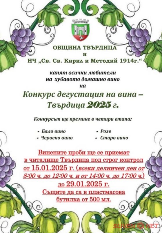 Община Твърдица и Народно читалище "Св. Св. Кирил и Методий 1914" организират традиционния Конкурс-дегустация на домашни вина – Твърдица 2025. Събитието е насочено към всички любители и производители на домашно вино, които искат да покажат своя талант и да се съревновават в различни категории.