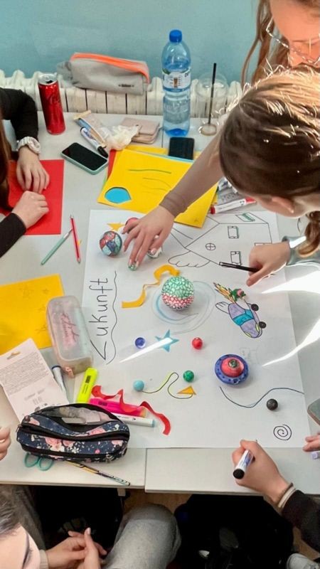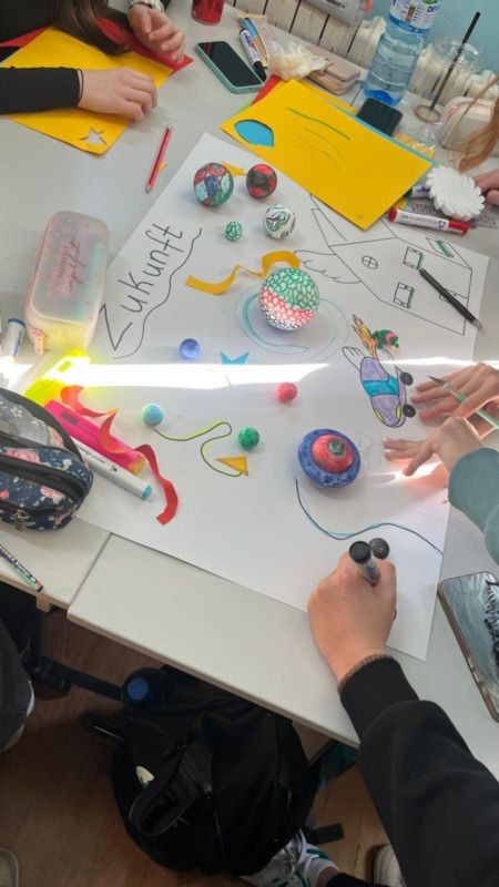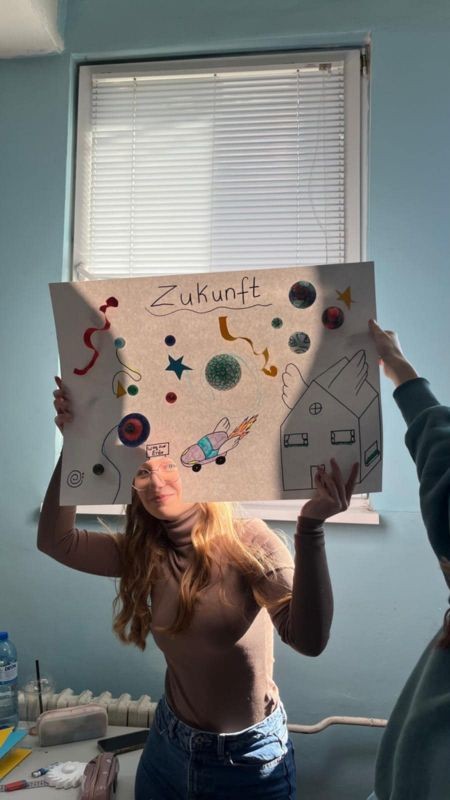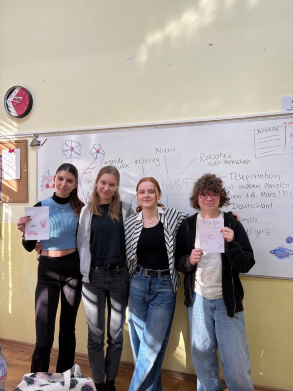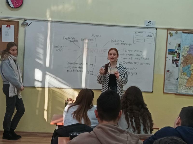 В рамките на проектната седмица всички ученици от немските паралелки имаха възможността, да разработят свои идеи по темата „Как си представяме бъдещето след 50 години?“ Учениците работиха по проектните задачи в творчески ателиета, като всички успяха да покажат своята креативност в екип и пресъздадоха идеите си за бъдещето на колажи и плакати. Освен това учениците разучиха популярна немска песен, която разкрива напълно предимствата и недостатъците от бързото и динамично развитие на света като цяло. Като заключителен продукт двете доброволки записаха изпълнението на немската песен от наши гимназисти, както и кратко видео с проектните разработки на всички класове!