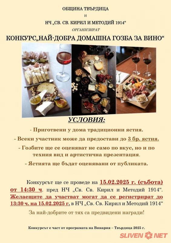 На 15 февруари 2025 г. (събота) в Твърдица ще се проведе конкурс за „Най-добра домашна гозба за вино“, организиран от Община Твърдица и НЧ „Св. Св. Кирил и Методий 1914“. Събитието ще започне в 14:30 ч. пред читалището, като кулинарни ентусиасти ще имат възможността да покажат своите кулинарни умения.
