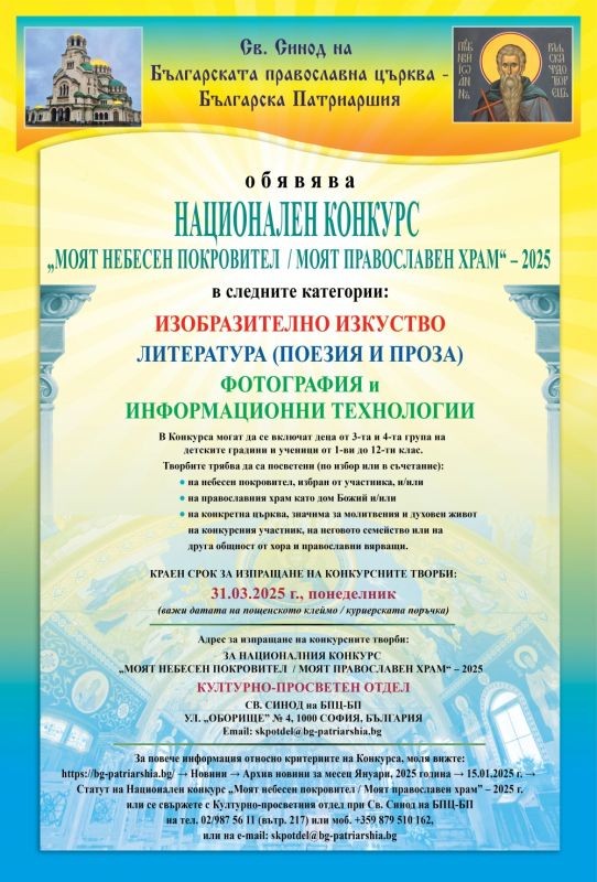 Обява за Национален конкурс „Моят небесен покровител / моят православен храм” – 2025